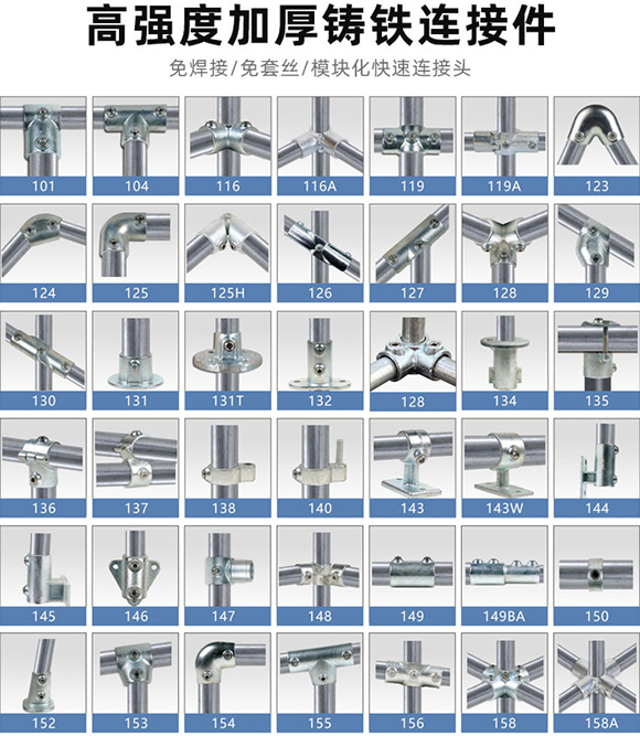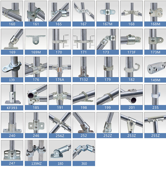 管接头通常用于安全护栏扶手, 栏杆,篱笆,操场设备,铁路栅栏,服装厂货架,商场货架,自行车棚,公交候车棚,运动场地围栏,舞台,机器设备防护栏,高速公路控制安装,路牌,屋顶防掉落系统,重型工作台,安全栅栏,零售展 示台,商店装备,挂物架,农艺园,温室,展台,工业和室外家具,临时建筑,轮椅通道,主题公园排队管理设施,帐篷,无墙车 库,亮化装置,屋顶护栏,电影布景,包厢,家居装修,公告牌,商业广告牌,公用设施,造船,可通行平台等等,只有想不到,没有做不到。